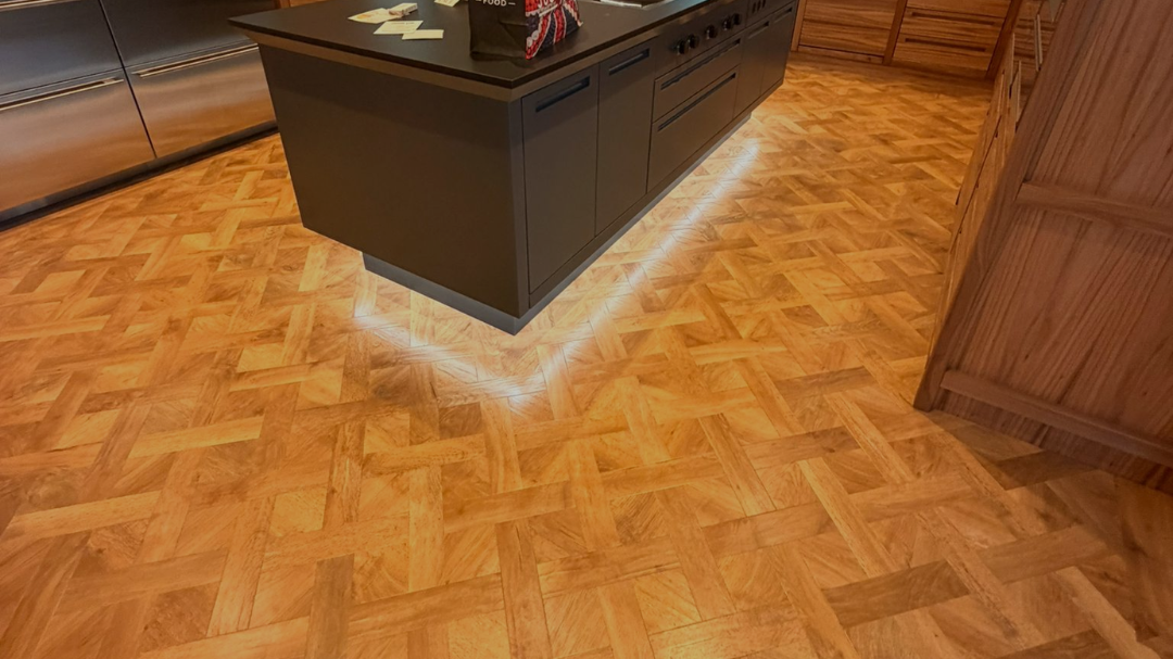 The basket weave design, combined with a single plank border, required exact measurements and careful set-out to maintain symmetry and consistency throughout the space. Our installation team meticulously aligned each element, resulting in a clean, balanced, and visually striking floor.